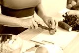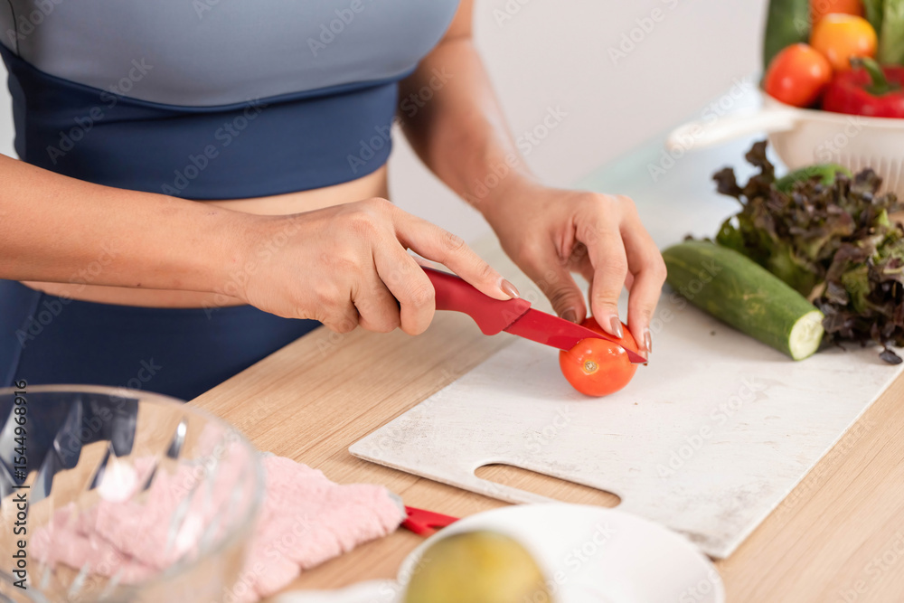 ESG and Healthy Cooking. Woman chopping fresh tomatoes in a modern kitchen.