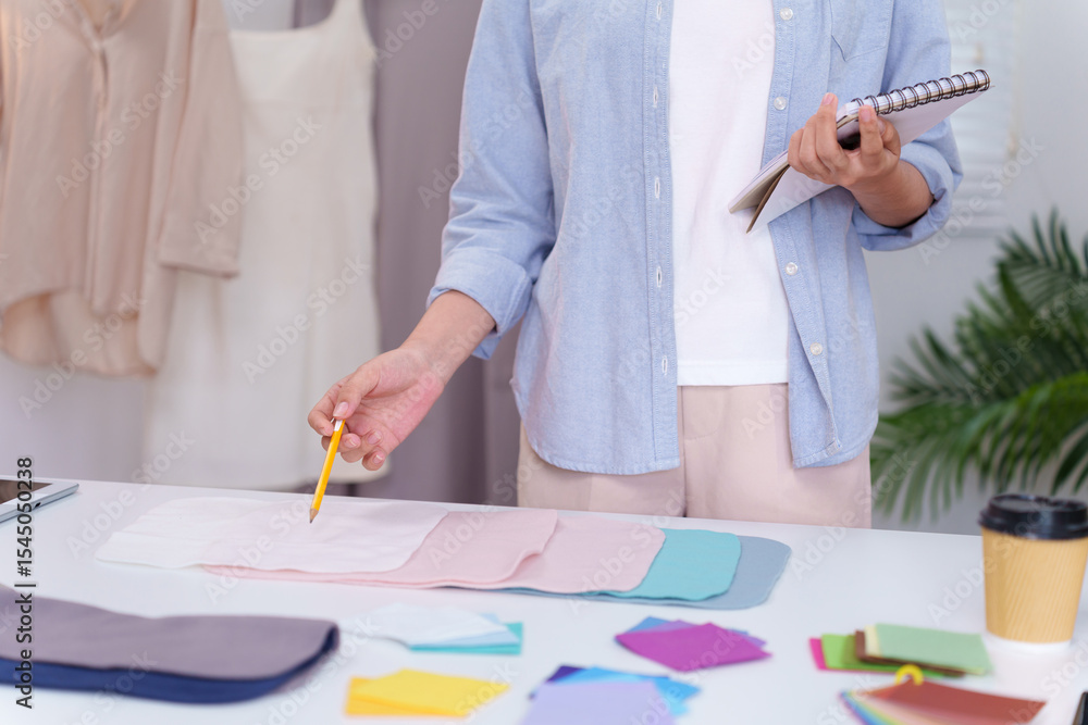 Fabric Selection by Asian Adult Designer for Fashion Apparel Creation Process Sewing Project Material Color Choice Tailoring