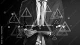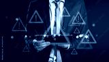 Businessman using tablet surrounded by red warning exclamation icons indicating network danger or fraud in digital virtual background.