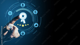 Digital hand pressing quality certificate icon with five-star rating on futuristic interface representing guarantee, compliance, and approved system.