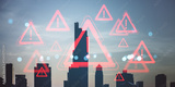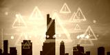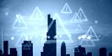 Red warning alert symbols with exclamation marks over a city skyline, symbolizing fraud or data danger in a digital network system concept.