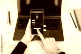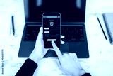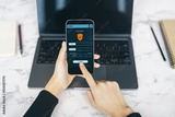 Person using smartphone to make secure online payment with laptop on desk in bright workspace background, emphasizing digital transaction safety.