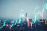 Financial stock market graph overlay on city skyline with glowing candlestick chart and buy-sell indicators in digital economy concept background.
