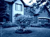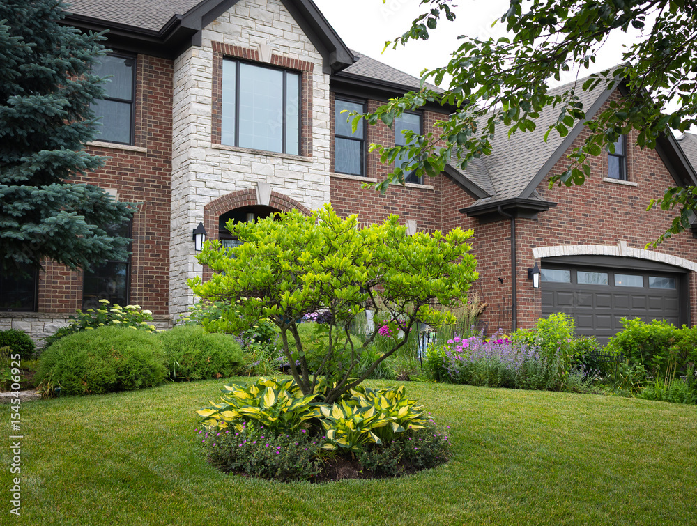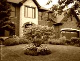 A graceful magnolia tree blooms before a stately Georgian home, its base lush with stained glass hostas that ripple in the breeze, adding soft texture and color to the elegant landscape.
