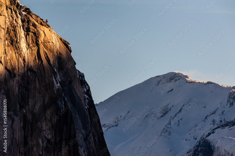 The first rays of the morning sun reflect off the rocks of the Sierra mountains in Yosemite national park, on a snow-covered new years day.