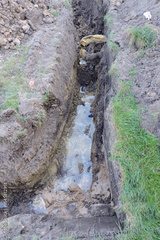 A broken plastic drainage pipe for land dewatering and the deep ditch partially filled with water in marshy land