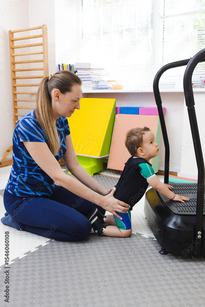 Therapeutic vibration therapy for little boy using a vibro-training machine with assistance of female physiotherapist