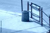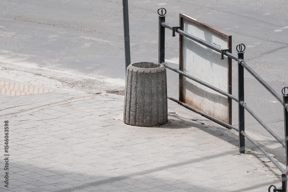 Urban Barrier with Concrete Bollard and Metal Gate in Sunlit Empty Streetscape, Gray Tones and Textured Surfaces.
