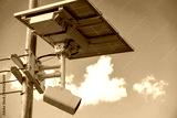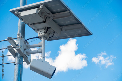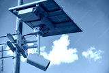 屋外に設置された太陽光パネル付きの監視カメラの写真。