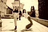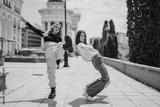 Two stylish friends strike energetic dance-inspired poses on a city street, showcasing their fun personalities and movement creativity.
