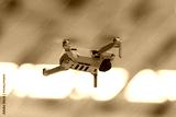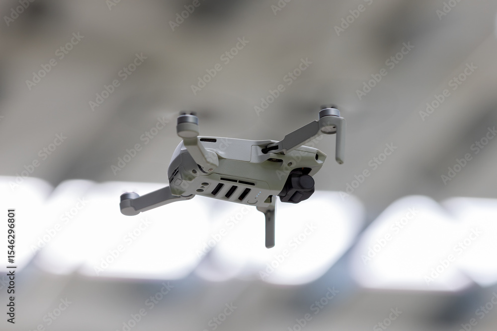 A compact, 249g grey drone hovers from a low angle, its propellers subtly blurred, suggesting it's actively recording video within an interior space