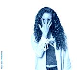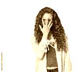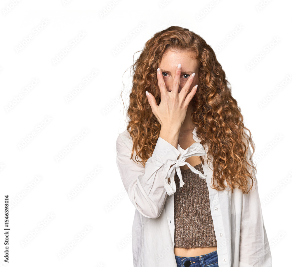 Simple redhead studio portrait blink at the camera through fingers, embarrassed covering face.