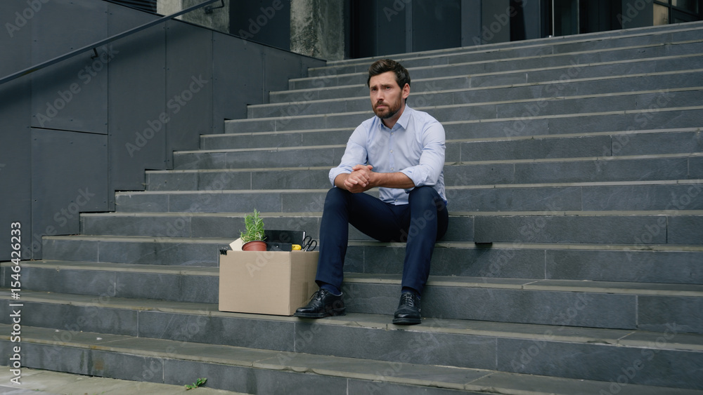 Stressed Caucasian middle aged business man lost job fired work sitting stairs near office building with dismissal box businessman male suffering sad thinking trouble crisis financial failure dismiss