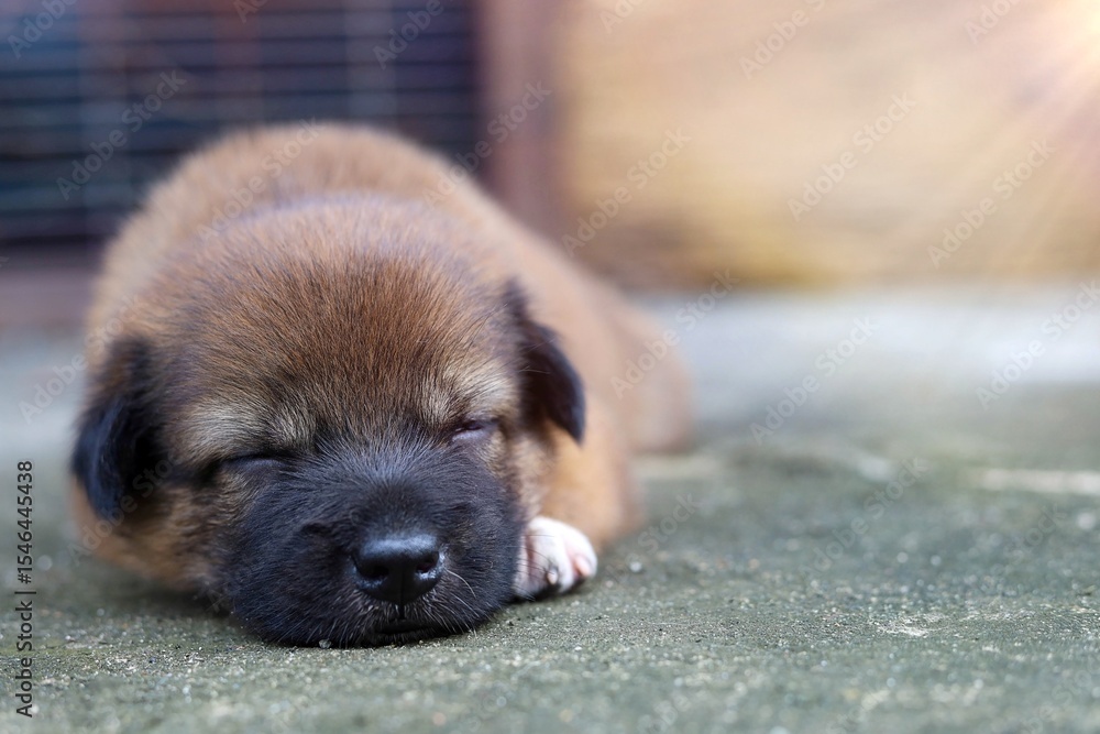 A small brown puppy is sleeping soundly on the floor.