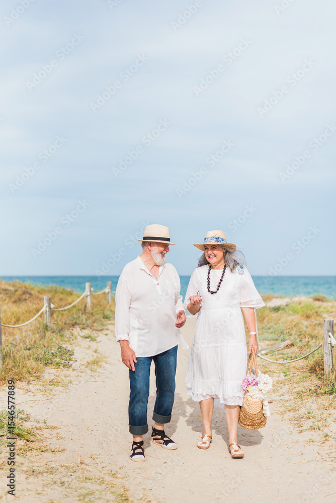 Happy retired couple walking on a sandy path to the beach, enjoying summer vacation and picnic