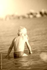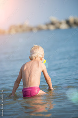 Little boy with snorkel by the sea. Cute little kid wearing mask and flippers for diving at sand tropical beach. Ocean coast.