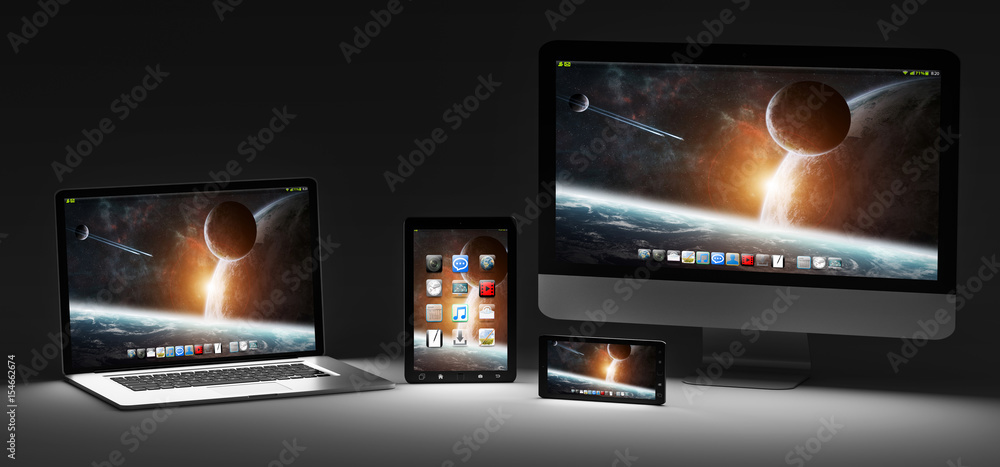 Dark modern computer laptop mobile phone and tablet 3D rendering