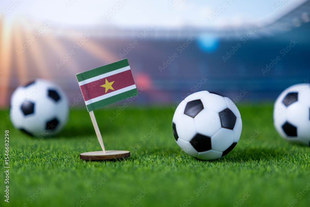 Suriname national flag with soccer balls rests on green grass against a blurred stadium background, symbolizing international football competition and team spirit