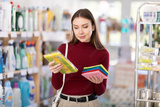 Woman chooses sponges and rags to clean the kitchen. Customer looks at accessories for cleaning