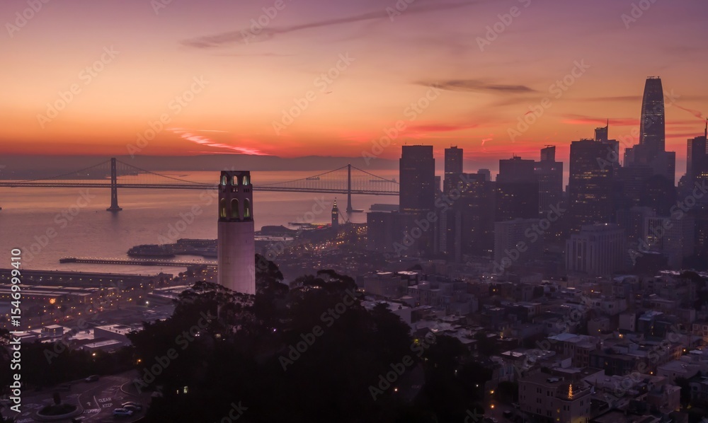 Aerial view of San Francisco, USA, at sunrise. Coit Tower stands prominently on Telegraph Hill, with the city skyline and Bay Bridge in the background.