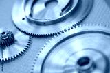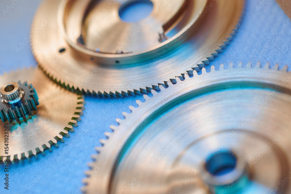Intricate cogwheels and gears display the beauty of clockwork engineering on a blue background