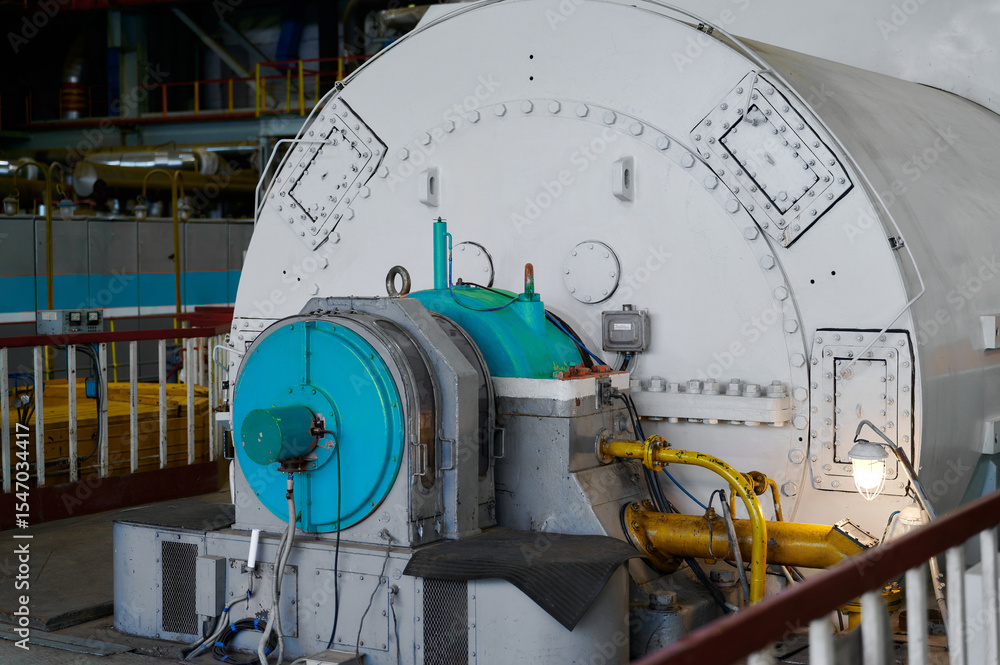Powerful industrial steam turbine generator set operating in thermal power plant machine hall environment