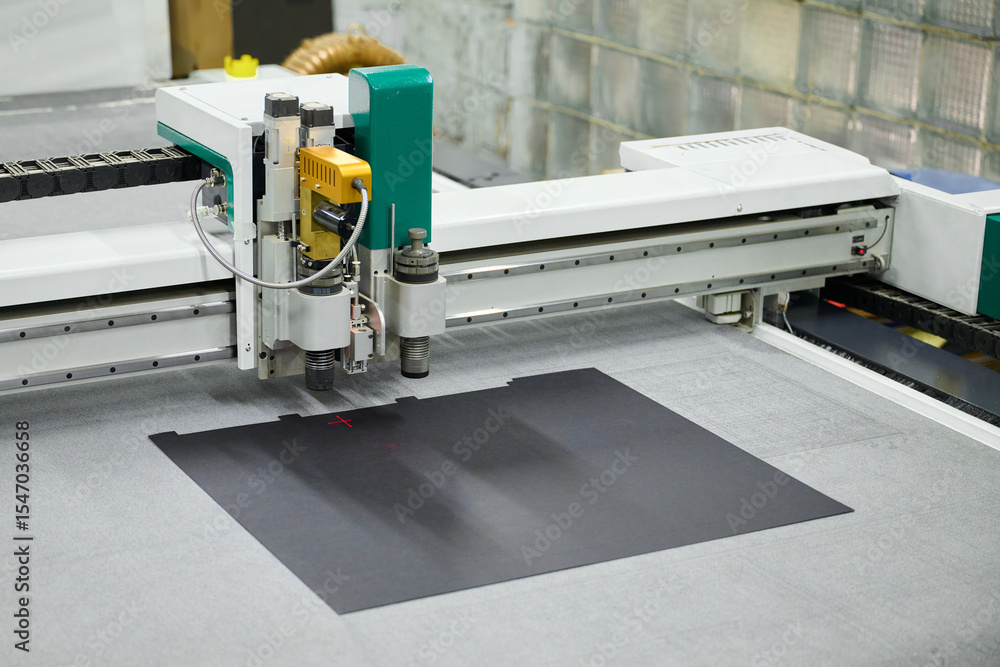 Precision cutting process using an industrial large-format CNC plotter for creative design work in a modern workshop setting