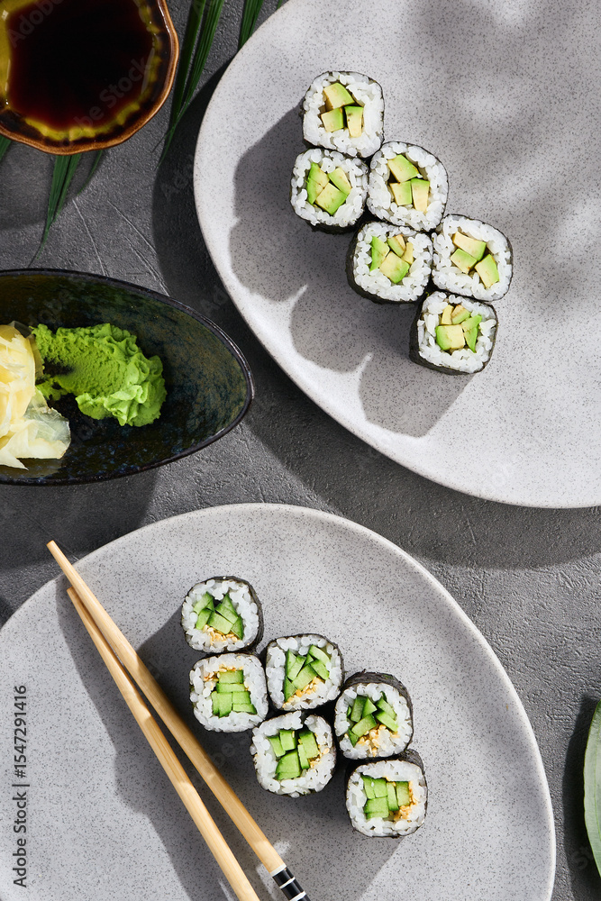 Avocado and cucumber maki sushi rolls, bright natural lighting, overhead composition set