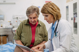 Geriatrician talking about test results with senior patient during check-up.