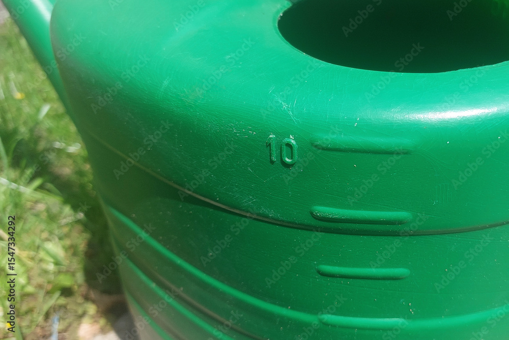 Green watering can with a capacity of 10 liters placed on a sunny garden path surrounded by grass