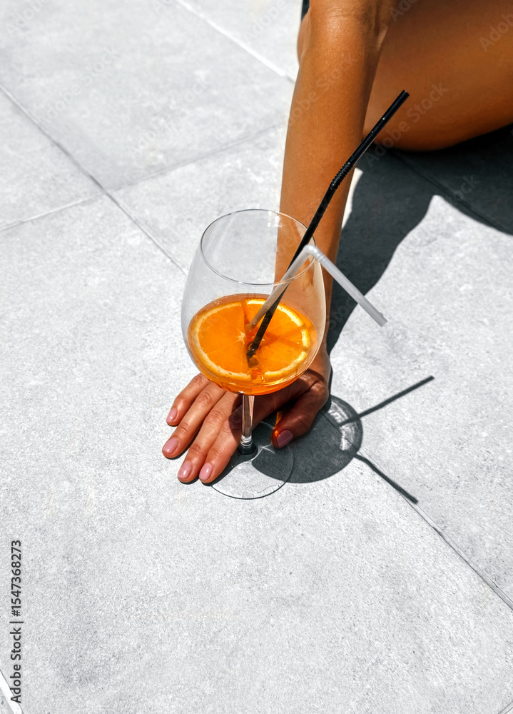 Cocktail, glass Aperol spritz cocktail in woman's hand, summer pool party concept, bar on the beach, refreshing drinks, holiday, vertical image
