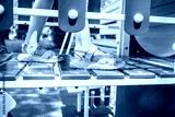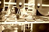 Close-up of a childs feet in sporty sandals walking on a wooden bridge at a colorful outdoor playground on a sunny day.