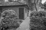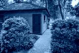 A rustic wooden cabin with a brown door stands amidst lush green bushes and trees, with a paved walkway leading up to it.