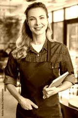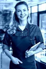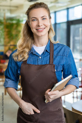 Pretty blonde woman in apron looking happy at her working place in pizzeria