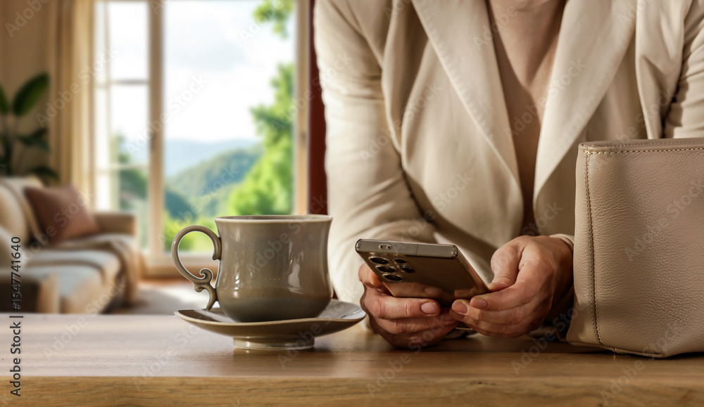 Close up of cup of coffee on the table and woman hands with smartphone. Cozy home interior.