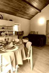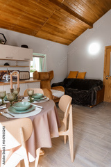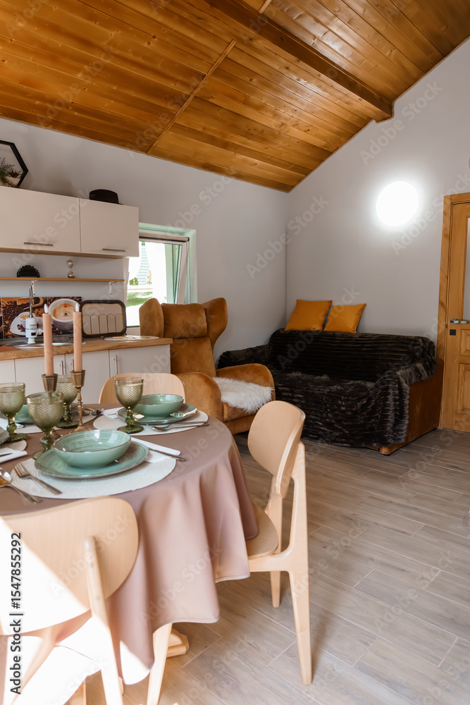 Cozy Rustic Cabin Interior with Dining Setting, Plush Sofa, and Warm Lighting: A Stylish Woodsy Retreat in Earth Tones