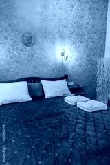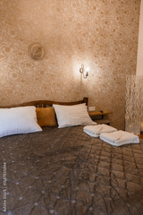 Luxurious Bedroom Interior with Beige Floral Wallpaper, Brown Bedding, Wall Sconce Lighting, and Elegant Decorative Elements