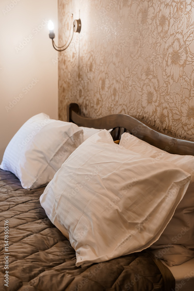 Cozy Bedroom Interior Scene with Unmade Bed, Floral Wallpaper, and Warm Lighting Suggesting Relaxation and Comfort.