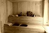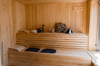 Cozy Scandinavian Sauna Interior: Natural Wood, Benches, Buckets and Towels, Relaxing Wellness Spa Scene in Warm Light, Minimalist Style.