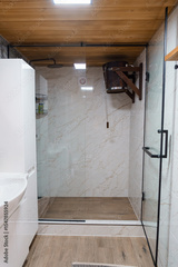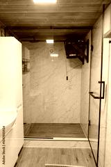 Modern Rustic Shower Room Interior Featuring Glass Enclosure, Wood Ceilings, Marble Tile Walls, Dark Wood Accents, and Minimalist Design.