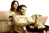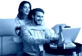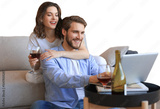 Happy couple sitting, relaxing on floor in living room, using laptop for online shopping together, watching movie on a transparent background