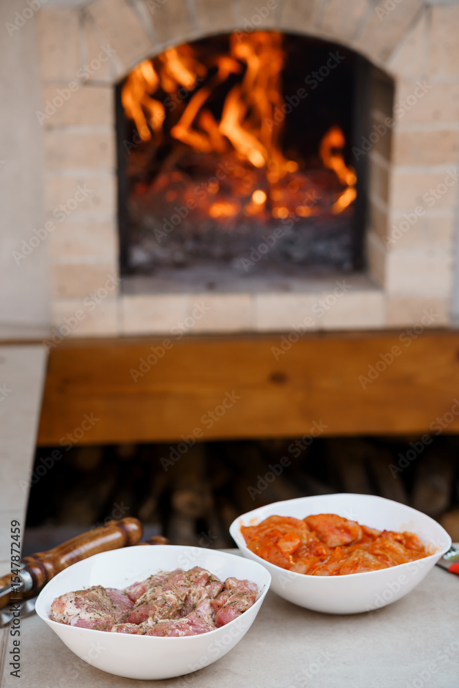 Rustic Outdoor Pizza Oven with Raw Meat Dishes, Fireplace Glow, Warm Italian Cooking Scene, Stone Texture, Food Preparation.