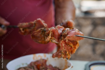 Hands Skewering Raw Marinated Lamb Meat on Metal Spikes, Outdoor BBQ Preparation, Red Tones, Culinary Scene.