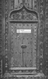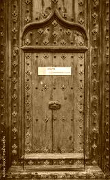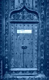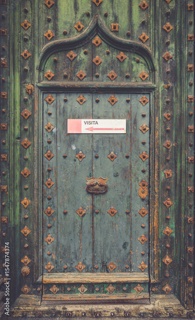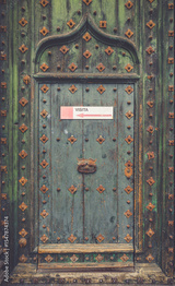 Spain - Beautiful blue green antique wooden door, with ogee arch, nails and tourist visit sign. Girona cathedral, Catalonia. Off the beaten path tourism. Christian architecture with Arabic influences.