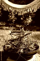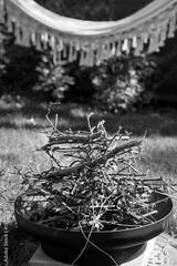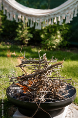 Cozy Backyard Retreat with Fire Pit, Hammock, and Greenery: Relaxing Summer Scene with Warm Lighting, Rustic Texture, and Peaceful Ambience