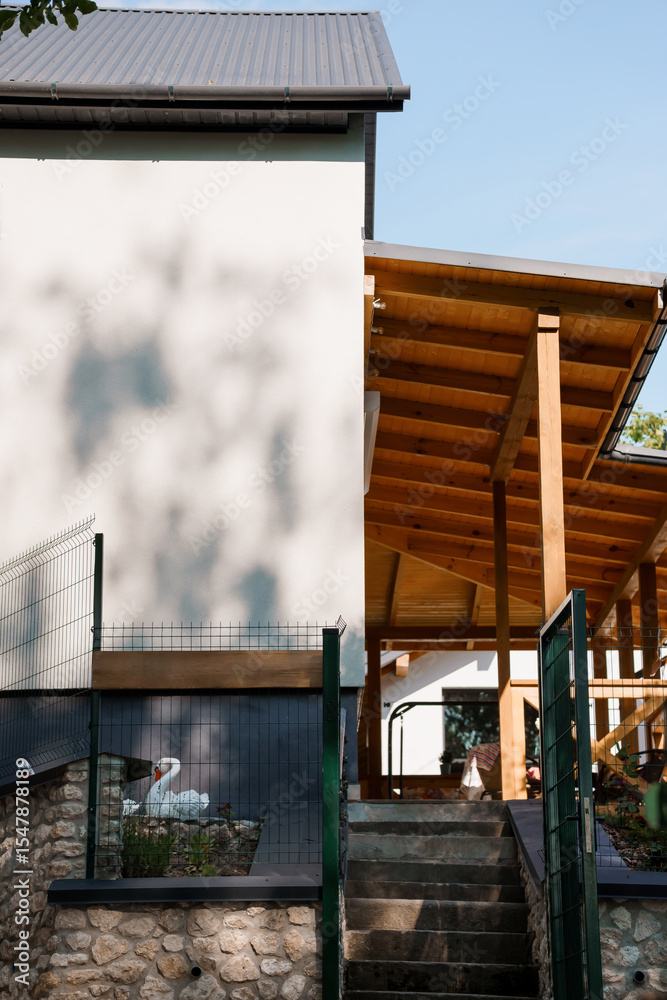 Modern Home Exterior with Wooden Porch and Swan, White Wall, Stone Foundation, Summer Daylight, Minimalist Architecture, Gray Roof and Green Surroundings