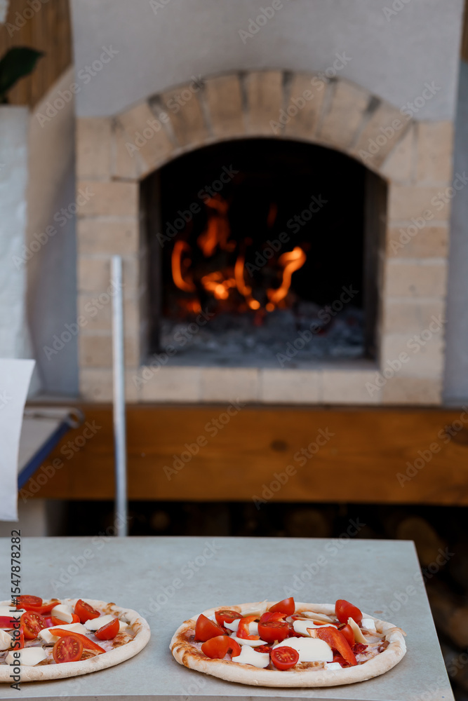 Rustic Stone Oven Pizza Making Scene: Warm Hearth Fire and Fresh Margherita Pizzas, Outdoor Kitchen, Authentic Italian Cooking, Natural Textures