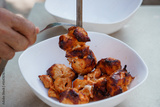 Delicious Grilled Chicken Skewers on White Plates, Close-Up Shot, Rustic Brown Texture, Culinary Food Photography, Tasty Middle Eastern Kebabs.