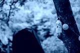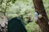 A camping scene with a water bottle hung from a tree, decorated with lanterns, and a tent in a natural environment surrounded by lush greenery.