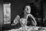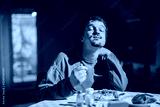 A young man wearing an orange sweater delighting in a meal served on a checkered table. Warm light emphasizes his relaxed ambiance in a cozy and modern indoor setting.